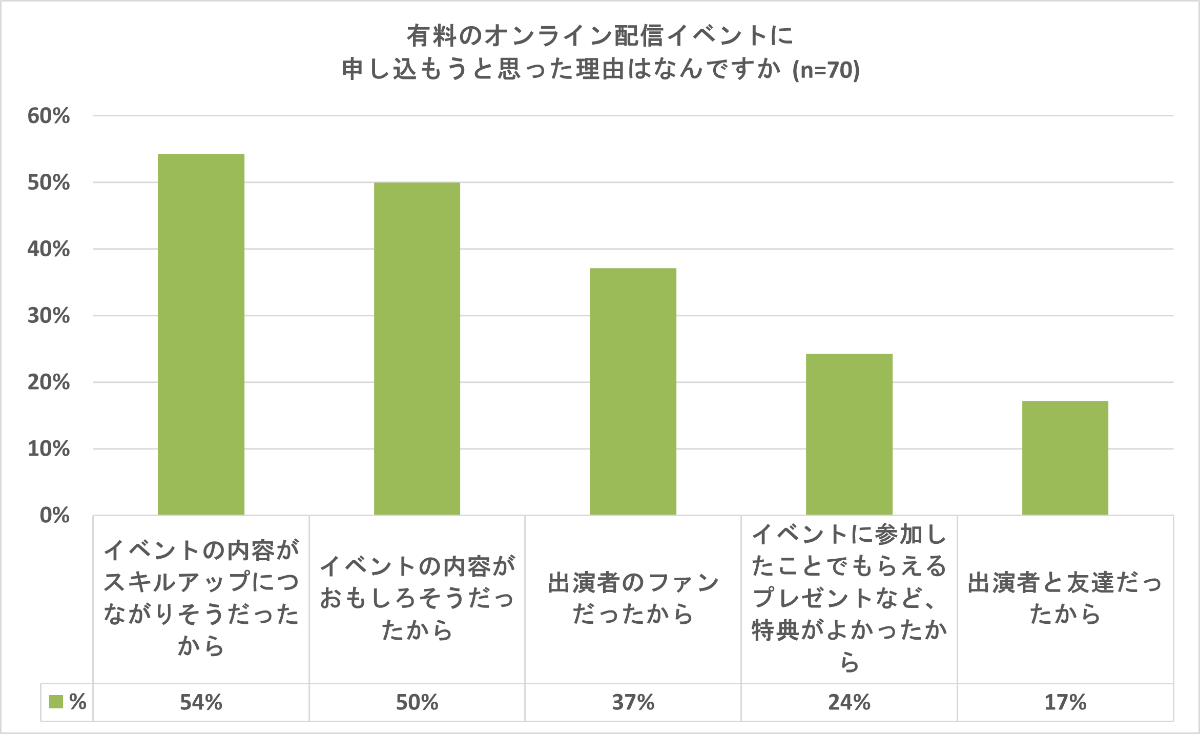 有料のオンライン配信の参加は34%となりました。実際どんな配信に参加しているのか尋ねたところ、54%が「スキルアップにつながりそうかどうか」、50%が「おもしろそうだったから」となりました。自身の学びを深めることができるという点が求めらているようです。