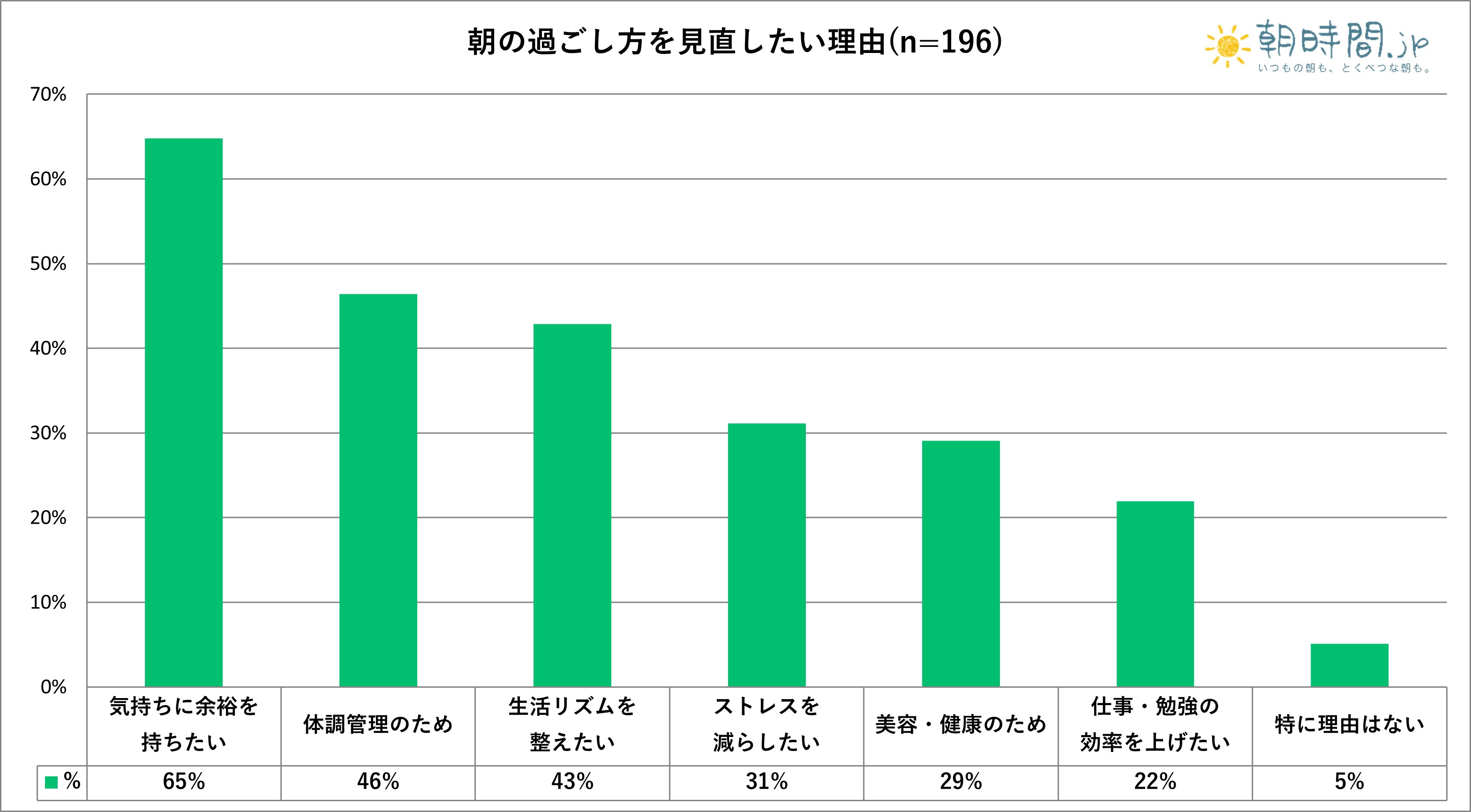 ・朝を見直す理由は「仕事・勉強の効率アップ」(22%)より、「気持ちに余裕を持ちたい」(65%)が最多